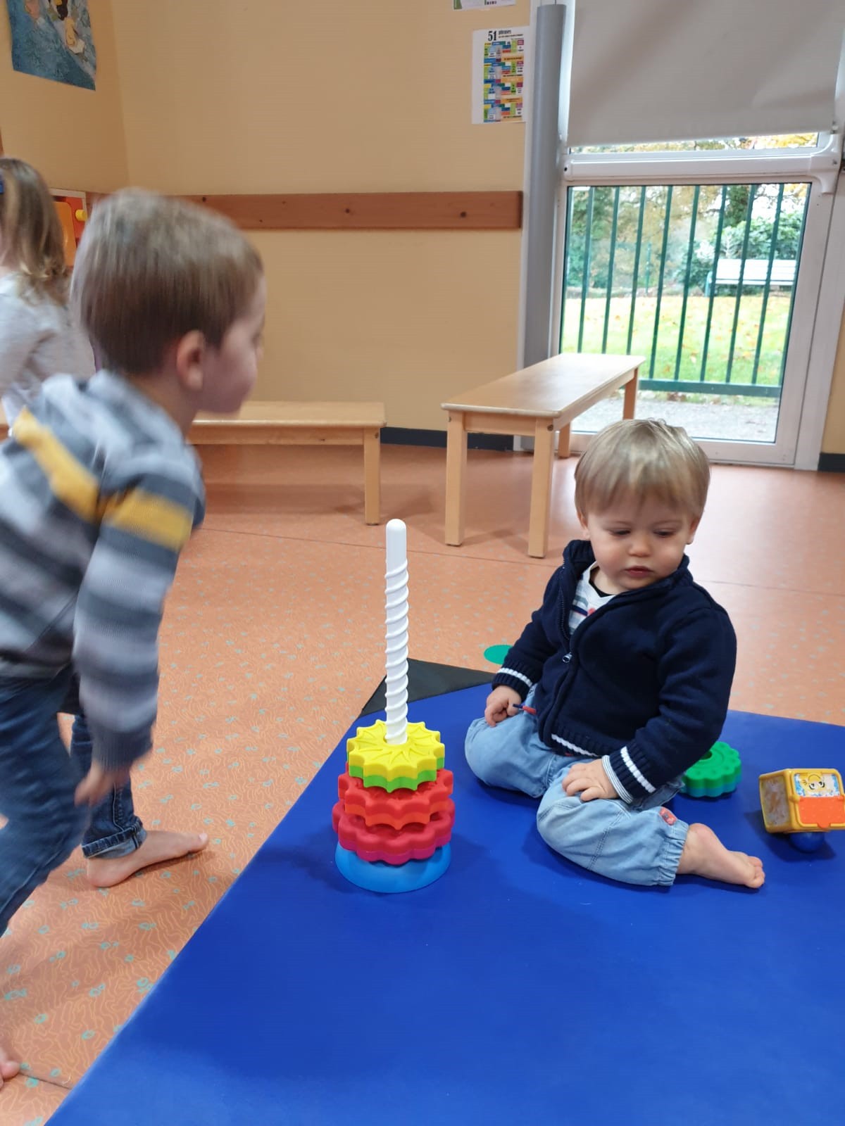 Ce mardi, c'est bibliothèque, livres : "Bonjour", "La Petite Poule Rousse", chants : Coccinelle, Une Poule sur un mur...Puis avant et après, découverte de nouveaux jeux, aussi plaisants les uns que les autres, avec des difficultés de différents niveaux, animaux aimantés, gros écrous à visser, miroirs, puzzles en bois, hochets en plexiglas et en plastique, puis notre incontournable "piscine à pâtes sèches que l'on transvase dans toutes sortes de récipients...