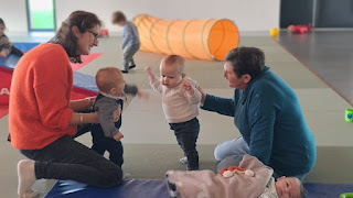 Ce mardi à la salle de dojo, nous retrouvons tous les copains et copines pour faire de la motricité. Parcours en suivant Françoise, bien sûr on s'échauffe un peu avant... Puis toboggan, culbuto, parachute pour se cacher dessous, structures en mousse pour monter descendre, glisser... On termine en chansons avant de se dire au revoir...